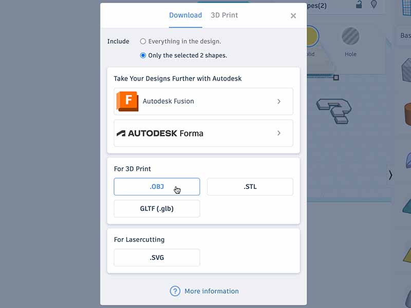 - For a single color printer: Place the cube and the lid close together. Select both of them and click "export". Select ".OBJ" as the file format and export them to your computer.