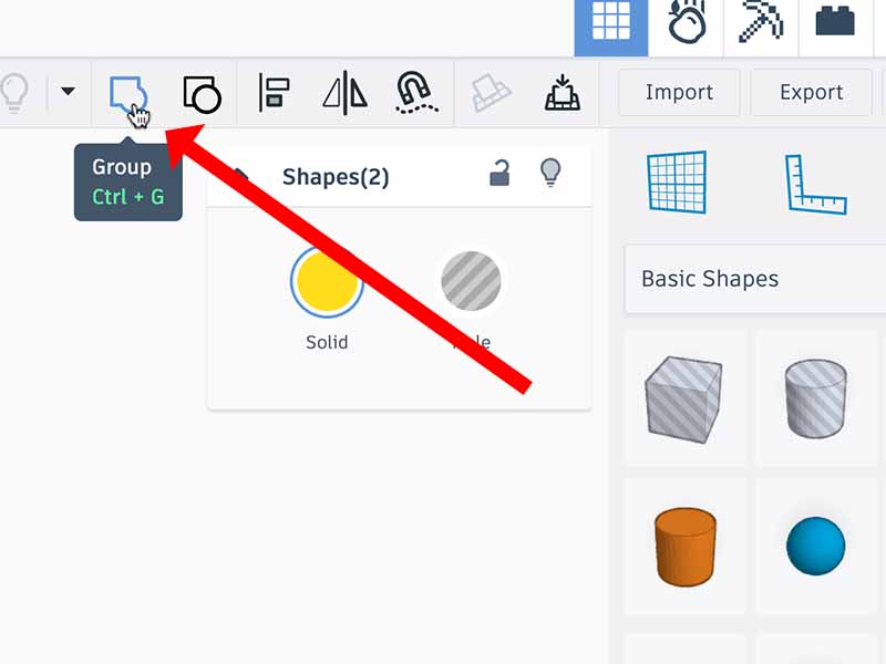 - With the hole and the cube still selected, click the "group" button to merge them together.