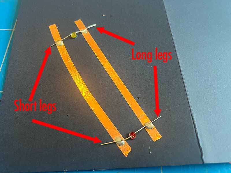 - Place the LED's trough the holes and bend the legs so that they touch the copper tape. Make sure all the long legs are attached to the same path of copper tape.