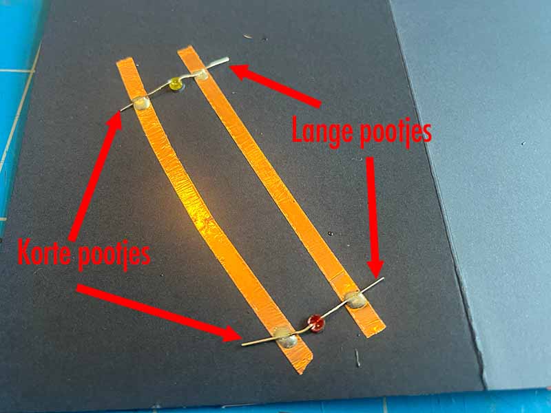 • Zorg ervoor dat alle korte pootjes naar de ene koper strip gaan, en dat alle lange pootjes naar de andere koper strip gaan.