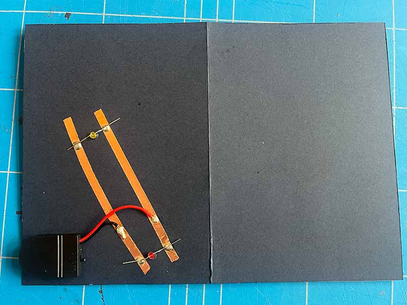 Een briefkaart met lampjes en een klein batterijtje.