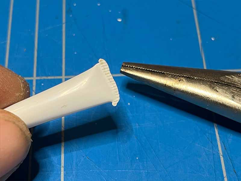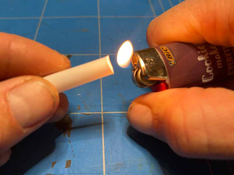 • Verhit één kant van het rietje met de aansteker en knijp het samen met de tang.