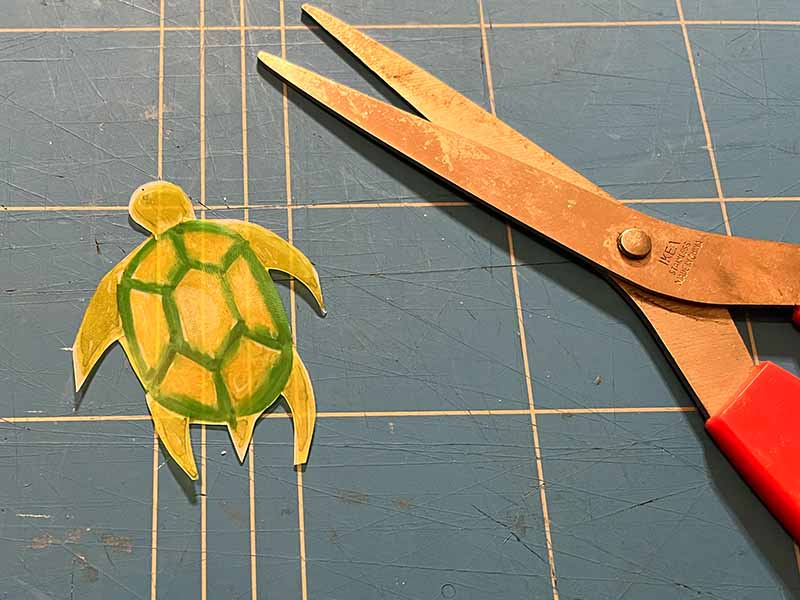 • Teken je duiker of zeedier op de glanzende kant van het plastic.