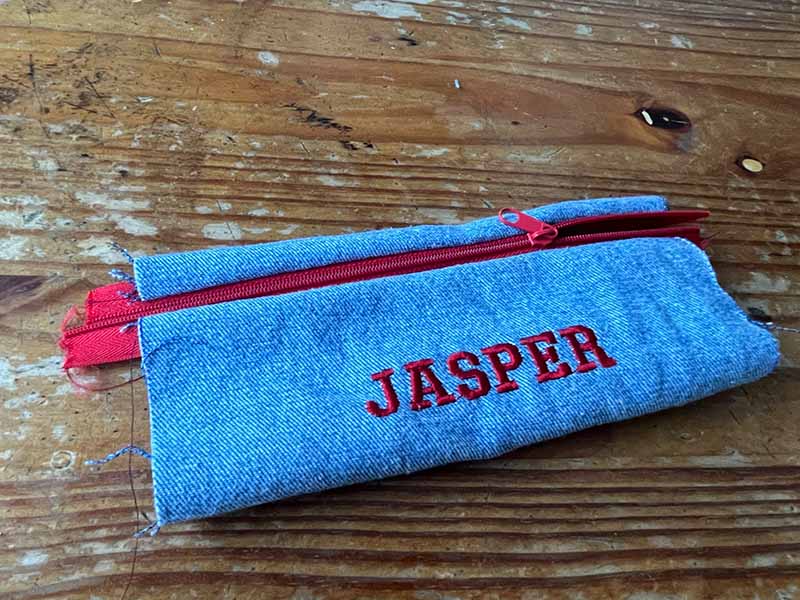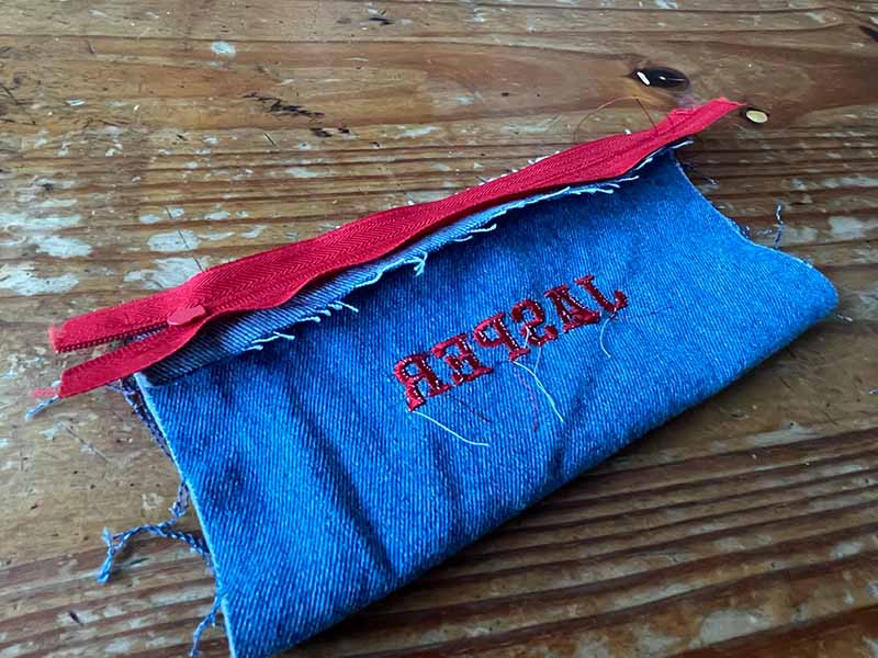 - Vouw de rits en de stof zodat de ritstanden nu naar buiten wijzen. Naai opnieuw, vanaf de buitenkant van de etui. Probeer een rechte lijn te maken en zorg ervoor dat je de stof van de rits in de naad meeneemt.