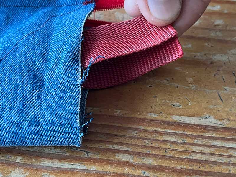 - Vouw het bandje en plaats het aan de zijkant in de zak. We willen het vastnaaien als we die kant sluiten.