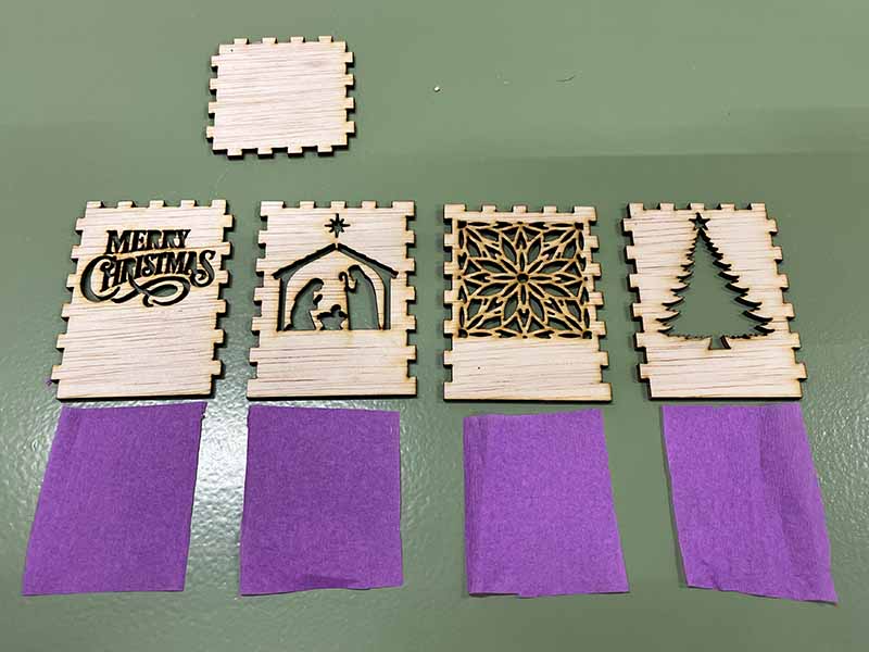 • Breng plakstift aan op de achterkant van de panelen en plak het crêpepapier over de uitsparingen.