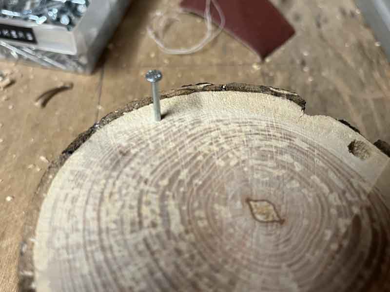 • Sla een spijker gedeeltelijk in de achterkant van de houtschijf.