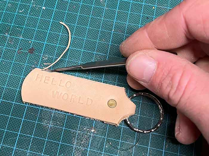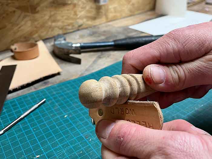 - Gebruik de slagletters en het aambeeld om een tekst in het leer te slaan.