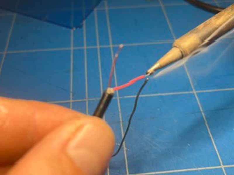 - Strip een klein stukje isolatie van de rode en zwarte draad en tin de uiteinden.