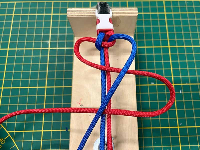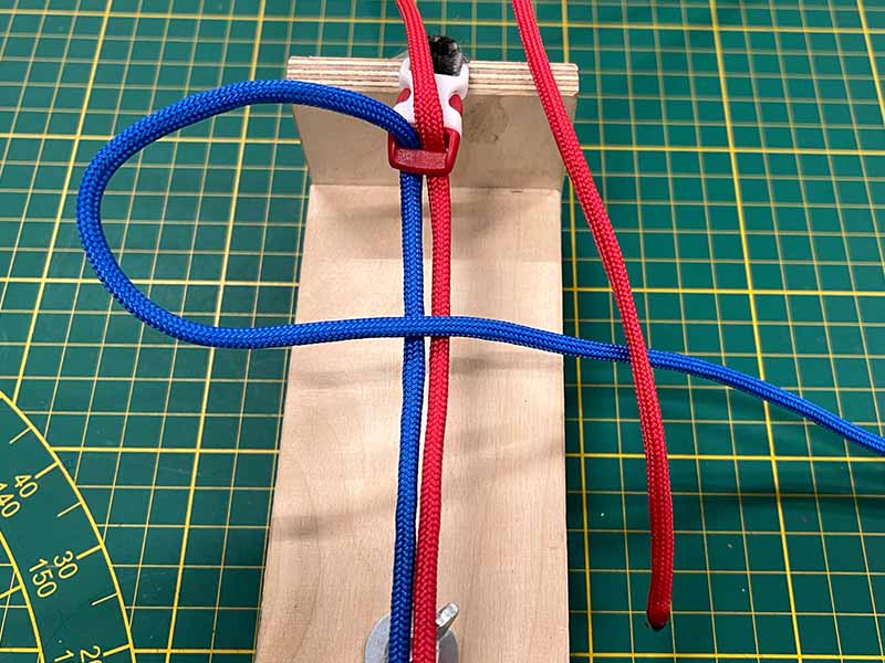 - Neem het touw dat links uitsteekt en maak een lus over de 2 middelste touwen.