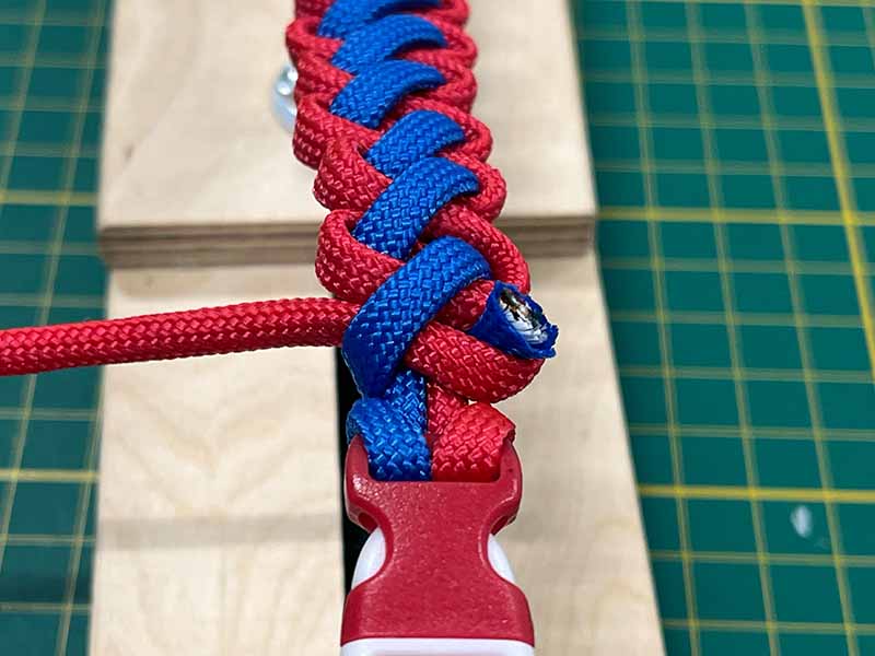 - Neem het andere uiteinde. Leg het omlaag over de eerste kleur, dan onder de 2 middelste touwen en door de lus van de eerste kleur weer omhoog.