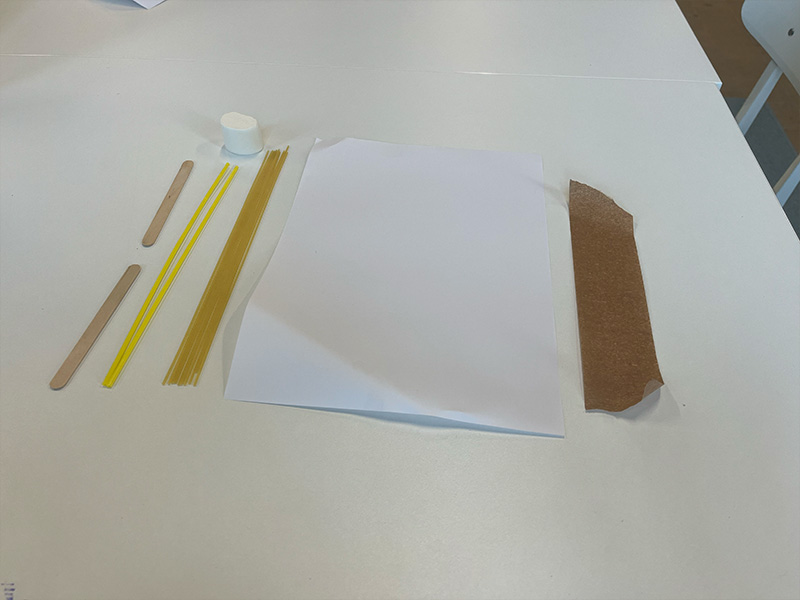 - Het doel van deze uitdaging is om de marshmallow zo hoog mogelijk van de tafel. De toren moet zelfstandig minstens 30 seconden blijven staan zonder hulp.