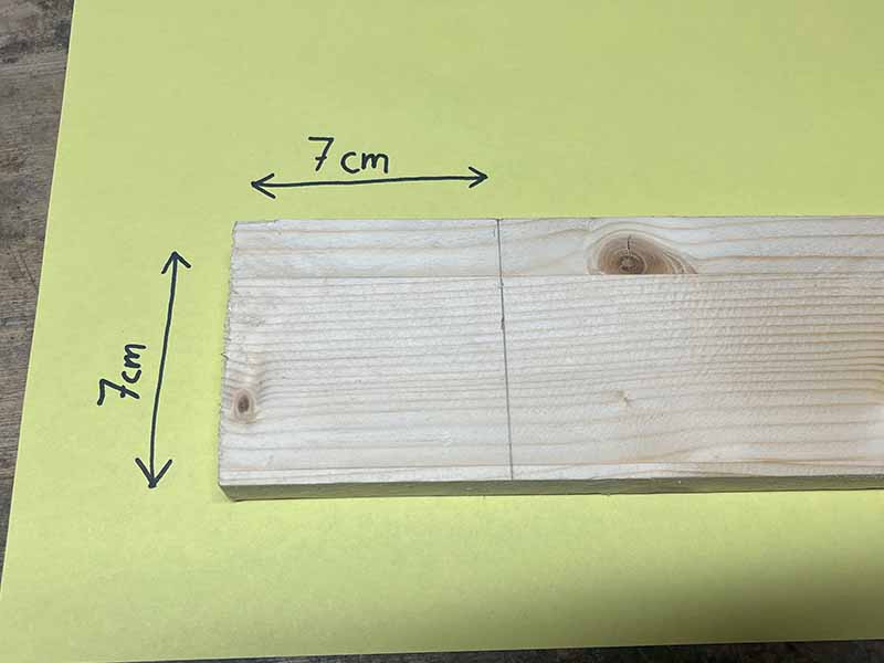 - Zaag een stuk hout om de basis van je speelgoed te vormen. Ongeveer 7 x 7 cm.