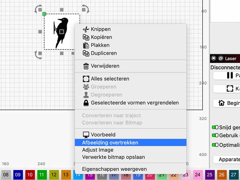 - Gebruik de overtrek functie van Lightburn om de specht over te trekken.