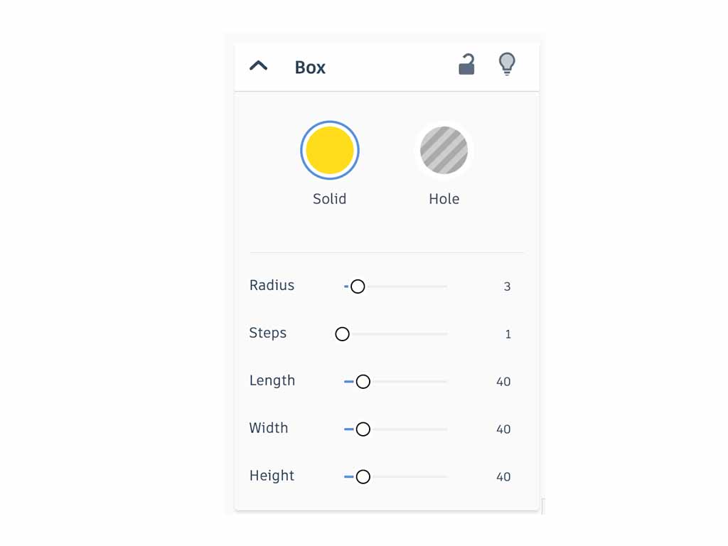- Because of a bug in Thinkercad, it is important to use the sliders in the property window to set the size. Do not use the white handles on the box itself.