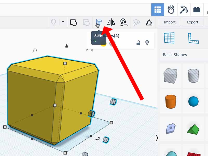 - Select the front holes and the cube together by holding the shift key and clicking both objects. Now click the "align" button.