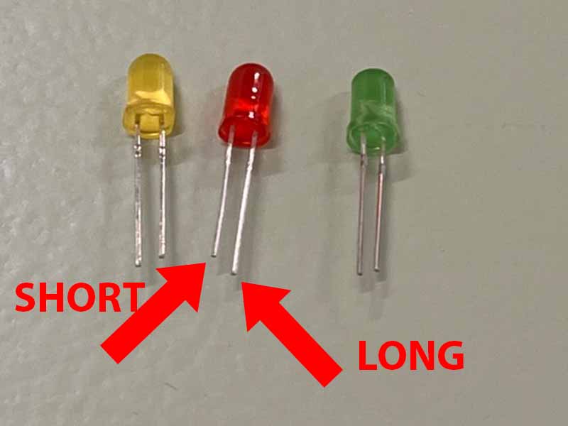 - Each LED has a long and a short leg. Place the LED's in the holes with the long leg to the left.