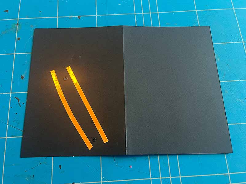 • Plak kopertape op de achterkant van de kaart. Zorg dat er één strip links van alle gaten loope, en één strip rechts van alle gaten.