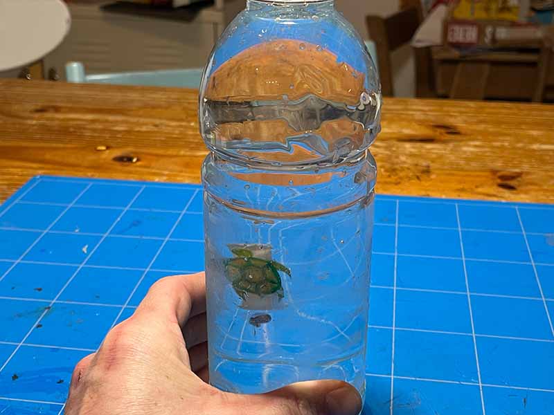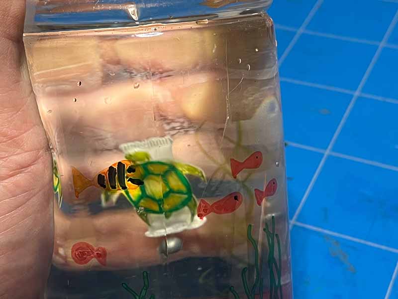 • Test je duiker: knijp in de fles. De duiker zou moeten zinken. Laat los en de duiker stijgt weer op.
