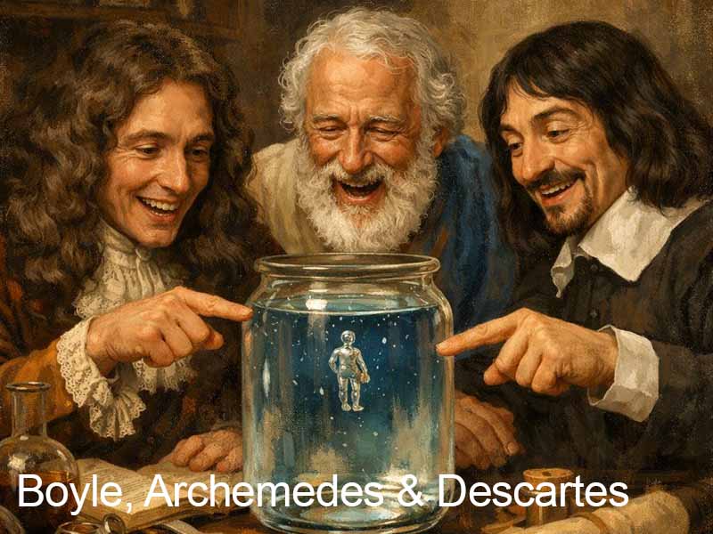 • Als je in de fles knijpt, knijp je ook de lucht in het drijvertje samen. Daardoor wordt het drijvertje iets kleiner. Het kleinere drijvertje heeft niet genoeg drijfvermogen (wet van Archimedes) om de gewichtjes boven te houden, dus zinkt het. Als je de druk loslaat, keert het drijvertje terug naar zijn originele grootte en drijft het weer omhoog.