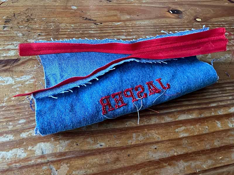 - Vouw het bandje en plaats het aan de zijkant in de zak. We willen het vastnaaien als we die kant sluiten.
