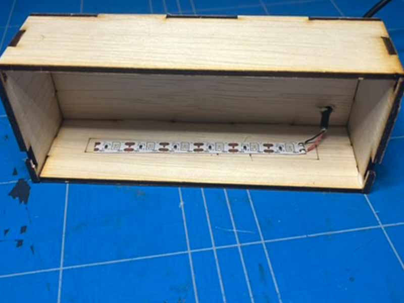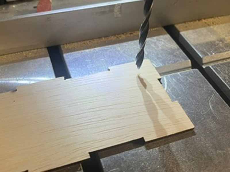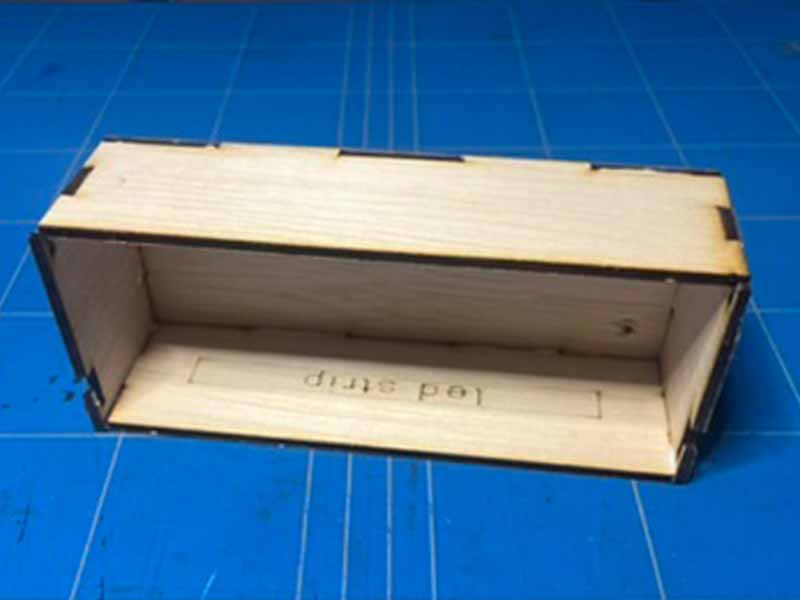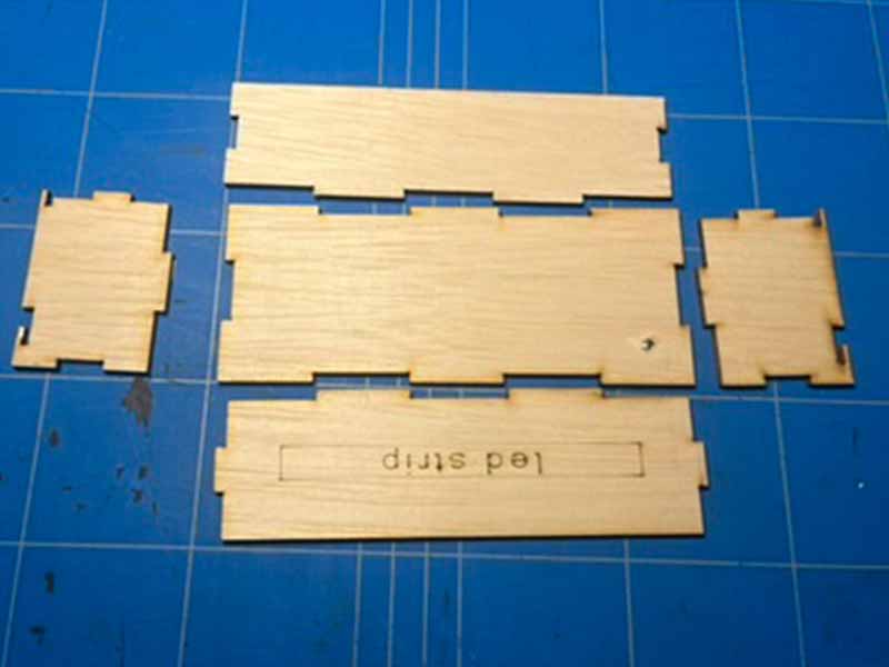 - Gebruik de lasersnijder om de houten en plexiglas onderdelen van het doosje uit te snijden.