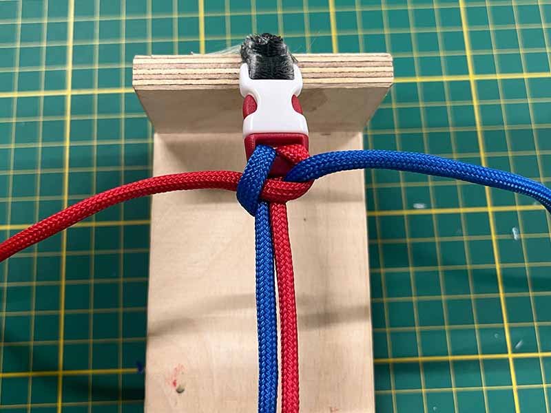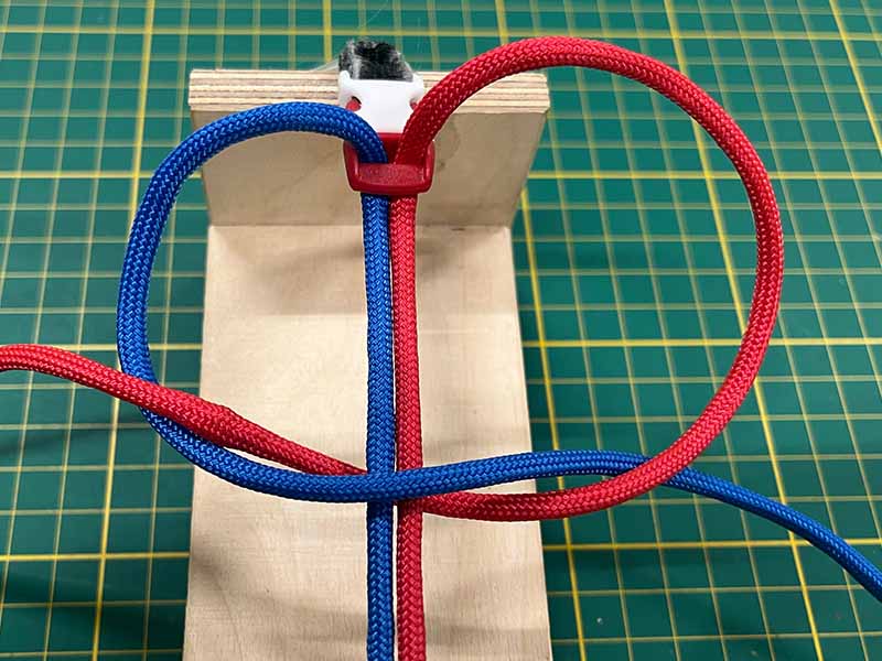- Neem het touw dat links uitsteekt en maak een lus over de 2 middelste touwen.