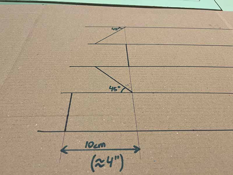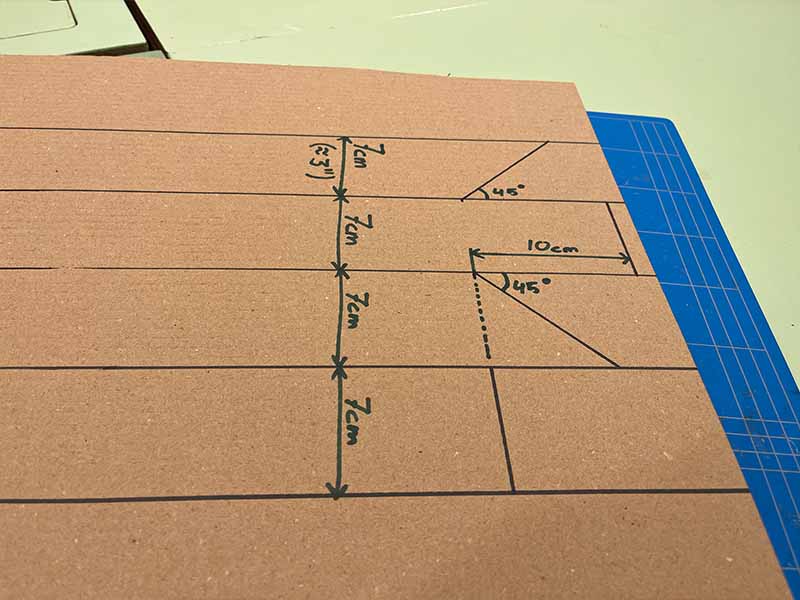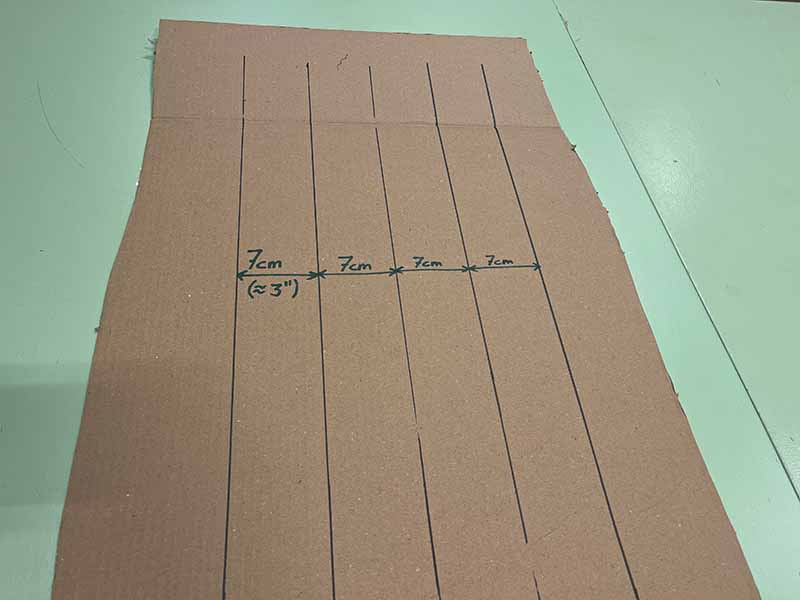 - Begin met het tekenen van 5 parallelle lijnen op je karton, 7 cm uit elkaar. De lengte is aan jou, dat bepaalt hoe lang je periscoop wordt.