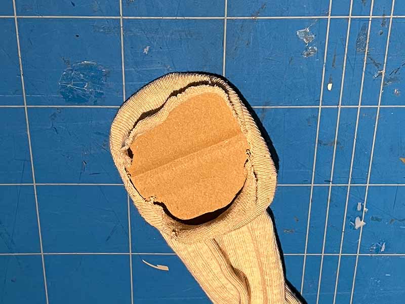 - Lijm de mondplaat erin. Knip overtollige stukken sok weg.