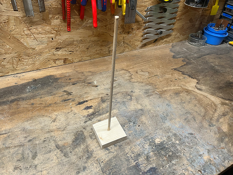- Gebruik houtlijm om de stok in het gat in de basis te lijmen. De geslepen kant kan makkelijk het het gat in.