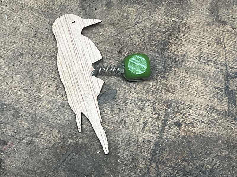 - Gebruik het lijmpistool om de veer aan de specht en de kraal met het grote gat te lijmen.